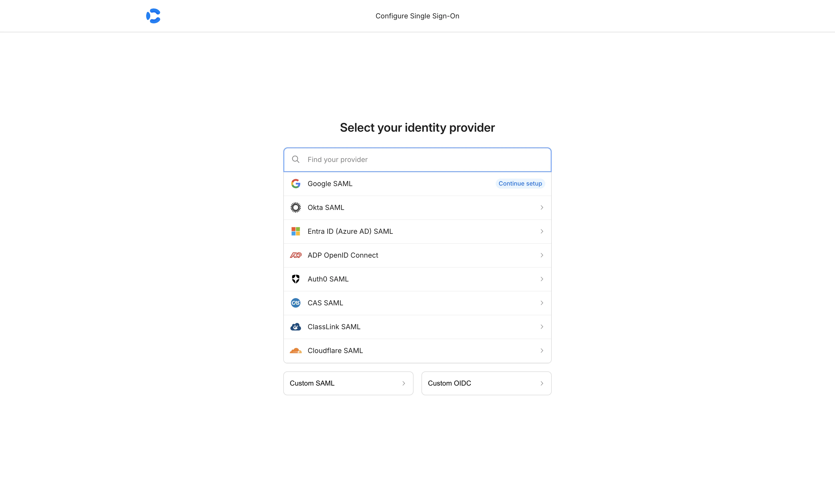 This opens the SSO admin portal where you select your identity provider and complete the SAML setup.