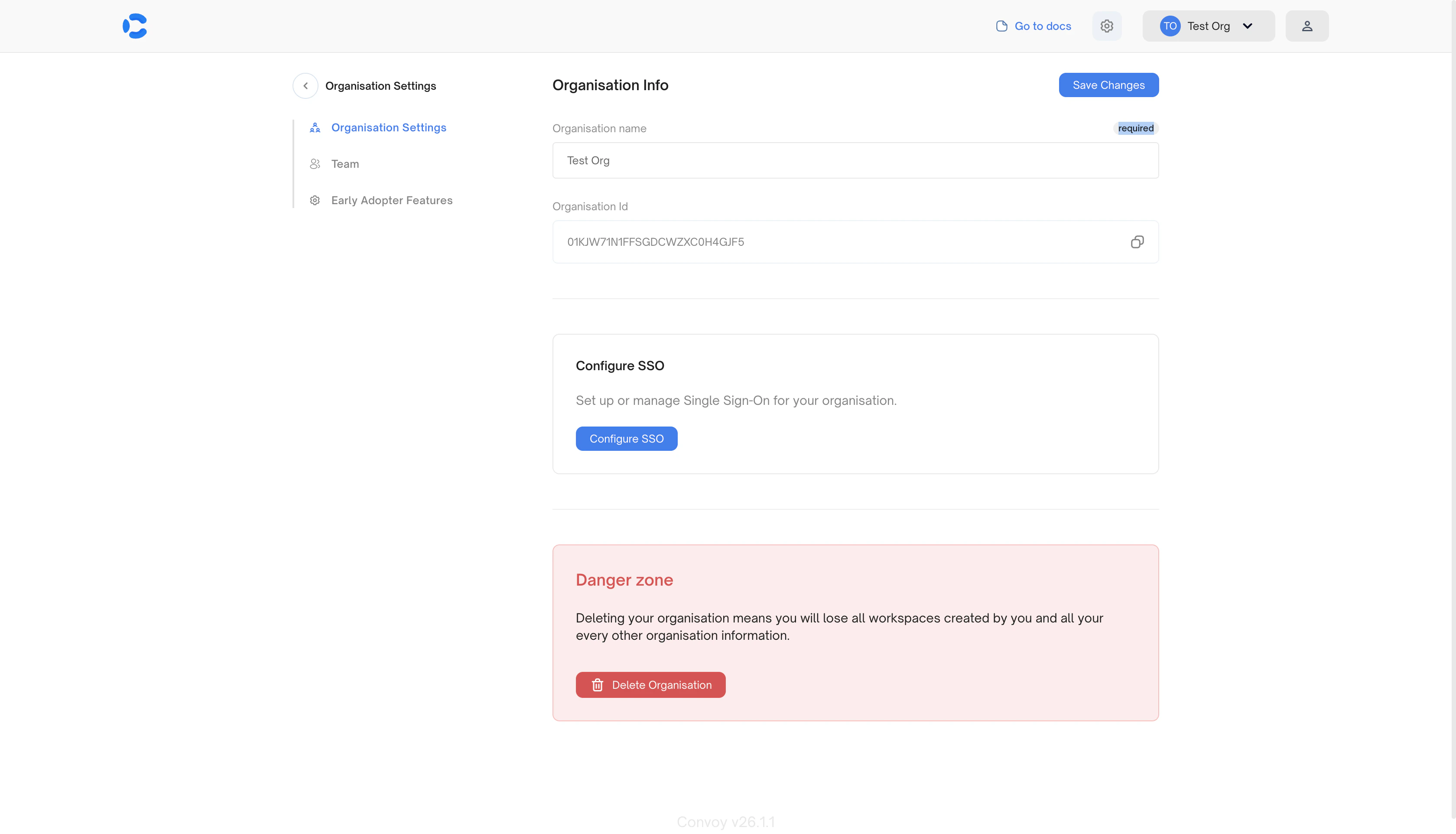 In the Convoy dashboard, go to Organisation Settings and click Configure SSO.